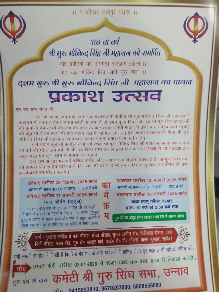 उन्नाव में गुरु गोबिंद सिंह जी के 359वें प्रकाश पर्व पर भव्य आयोजन की तैयारी।